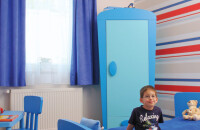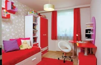 A lányszoba piros, a fiúszoba kék – ami különleges itt is, az a tapéta, illetve a színek bátor párosítása.