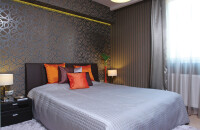 A hálószoba szó szerint új színt visz a lakásba. Jó példa arra, hogy érdemes szembefordulni a sztereotípiákkal. A sötét tónusú tapéta nem szűkíti, és barátságtalanná sem teszi a szerény alapterületű helyiséget. Külön figyelmet érdemel a gipszkartonból épített karnistakaró, amely szintén egy olyan apró részlet, ami az egész lakásra jellemző, és a szakember gondosságát dicséri.