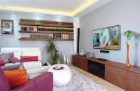 A színekkel oldott minimál hangulat közös választás eredménye. A háziak eleinte a barna-fehér párost preferálták, aztán szembejött egy lila fotel, és ez mindent megváltoztatott. A gömbölyded kisasztal a házigazda választása, némi bohémságot csempész a szögletes diófa-furnérozású bútorok közé.