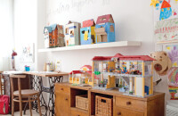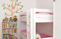 A lányok közös szobájában is sok saját készítésű bútor és dekoráció található. A Singer állványra szerelt asztallap íróasztalként, a régi komódok játéktárolóként funkcionálnak. Az emeletes ágy melletti falat házi gyártású, lécekből szabott és összecsavarozott faforma díszíti. A gyerekekkel közös egyedi alkotásra szivárványkartonból vágtak leveleket. A fácska szépen rímel a mennyezeti lámpára akasztott szivárványmadaras mobilra, ami ugyancsak közös alkotás.