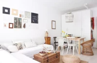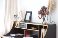 A berendezésnél fontos szempont volt, hogy a lakás a hétköznapi funkciókon túl kreatív műhelyként is szolgáljon. Az előző lakásból hozott nagy kanapé merész ötletnek tűnt, mégis jó döntésnek bizonyult, térelválasztóként is szolgál: térbe forgatott oldala mögött elfér a nemrég felújított íróasztal és az ékszerkészítés kellékei is. „Szeretem keverni a stílusokat, megmenteni a kacatokat, sok minden született így a lakásban” – mondja Ildi.