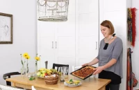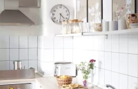 A konyhában – hogy elkerüljék a dobozszerű hatást – a munkapult felett szekrények helyett polcok sorakoznak. A lakók kreativitása itt is érvényesül: a falra a gyerekek „étkezés”-tematikájú rajzaiból készült különleges montázs.