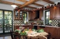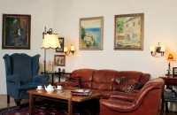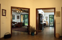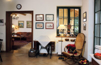 A ház meghatározó bútorai a maratott rusztikus parasztbútorok, és az a néhány családi darab, amelyek nagyszülőktől, dédszülőktől maradtak rájuk. Az ablakrácsokat egy öreg kovácsmesterrel készíttették el, a dédmama házának ablakait egykor díszítő rácsok mintájára. Amikor funkcionalitással, praktikummal és esztétikummal kapcsolatos kérdések merültek föl bennük, kedves barátjuk, Tasnádi Marianna belsőépítész látta el őket tanáccsal. Marianna javaslatára az előtér és a konyha padlózatának burkolására ugyanolyan színű padlócsempét választottak, mint a nappali parkettájának színe, hogy az látványában tágítsa a teret. Az aprólékos tervezésnek és odafigyelésnek köszönhetően olyan otthont teremtettek vendéglátóink, ami önmagukat tükrözi: eggyé olvad a múlt és a jelen. Egy régi paplak gerendái tartják a háztetőt, az ablakrácsok a dédmamára emlékeztetnek. Léleksimogató.