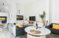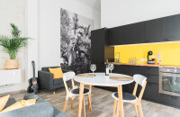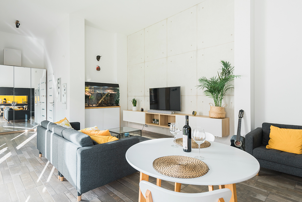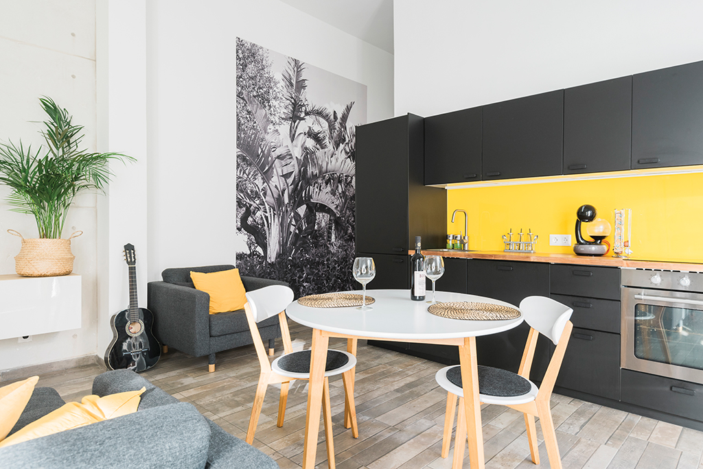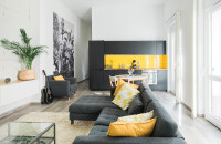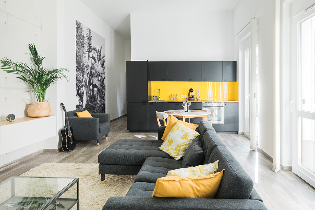 A fiatal tulajdonos egy nagyon jól elrendezett, átlátható, modern otthon kialakítását kérte, Roberta ehhez igazította az egész térszervezést. A nappalit, étkezőt és konyhát egy légtérbe helyezte, és egy karakteres enteriőrt álmodott meg. A tér különlegessége, hogy a nappaliból és az egyik hálószobából is közvetlen kijárás nyílik a teraszra, ahonnan már csak egy lépés a zöld kert. Az alaphangulatot a fekete és sárga kontrasztja határozza meg. A nappaliban hatalmas fekete kanapé uralja a teret, amely remekül harmonizál a szintén fekete frontokkal rendelkező konyhabútorral. A konyhai hátfalat azonban élénk, napfényes sárga szín oldja, így az enteriőr játékos, energikus ritmust kap. „Szeretem, ha a színek egymással beszélgetnek. A fekete dominanciáját itt nem komorrá, hanem izgalmassá teszi a sárga dinamizmusa.”