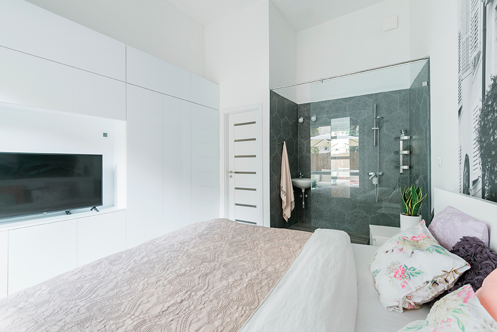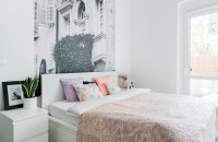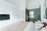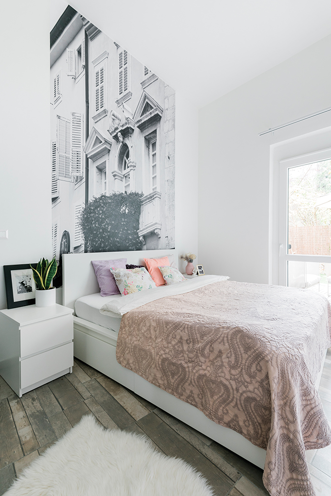 A nappali tévéfala külön figyelmet érdemel: fa és fehér elemekből épített látványos, tárolós megoldás, ami nemcsak funkcionális, de vizuálisan is meghatározó eleme az enteriőrnek. A betonhatású fal egy grafikus egyedi munkája, ezzel a loft hangulat is finoman megjelenik a skandináv hatás mellett. A hálószobavilágos, barátságos, az ággyal szemben beépített tévéfal kapott helyet. Az ágy mögötti falra egyedi, a régmúltat idéző tapéta került, az üvegfallal elválasztott zuhanyzó pedig extravagáns megoldás. „A nagyobb hálószobához tartozó zuhanyzót én javasoltam, mert úgy éreztem, hogy ez a különleges megoldás, plusz komfortot és egyediséget ad majd” – mondja a tervező. A másik hálószoba sem marad el funkcionalitásban: jól elszeparált, világos, ideális vendégszobának vagy dolgozószobának. A finoman texturált tapéta, amely szintén egy régi városrészt ábrázol, a fehér dominanciája letisztulttá teszi a kis helyiséget.