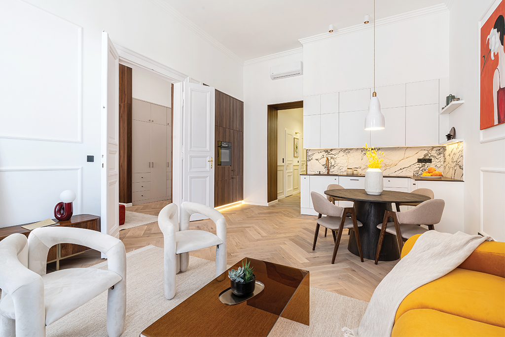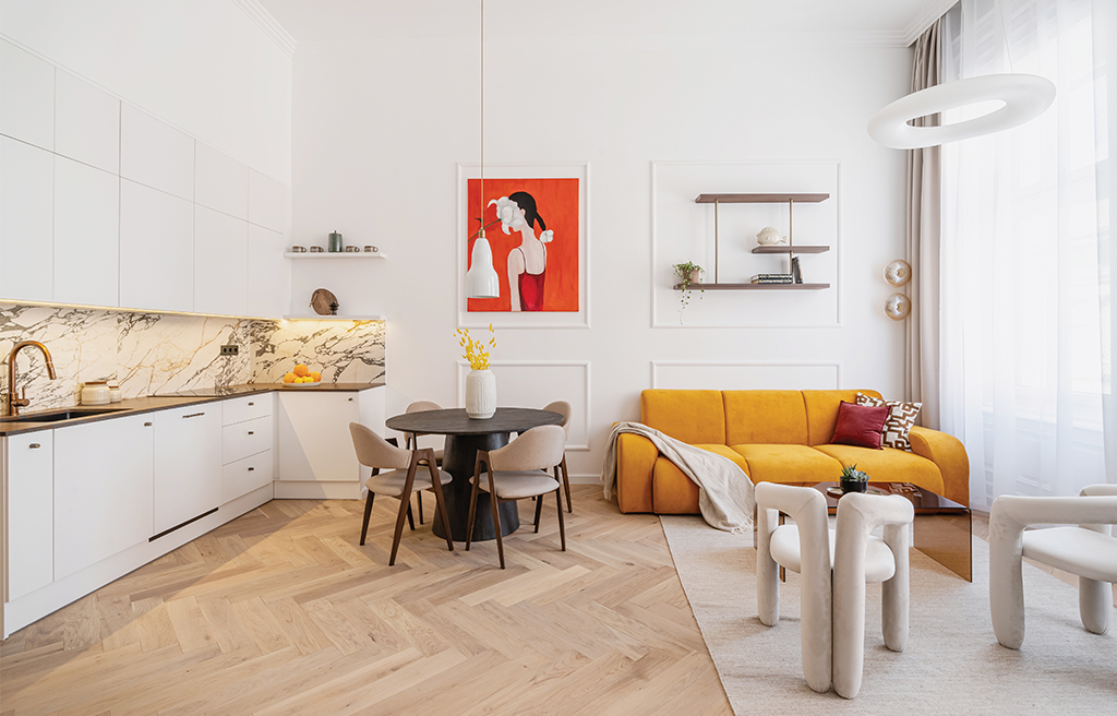 A budapesti Palotanegyed mindig is különleges helyszíne volt a fővárosnak: történelmi házai, klasszikus homlokzatai és hangulatos utcái egyedülálló környezetet teremtenek. Ebben a városrészben örökölte meg fiatal, friss diplomás vendéglátónk a nagymamája 85 négyzetméteres lakását, amely így élete első, saját otthonává vált. A terek kialakítását Mede Mariann és Bojtos Emese jegyzi, akik érzékenyen, a legfinomabb részletekre is ügyelve dolgoztak. Az alaprajz átalakítása során a nappali, étkező és konyha egy légterűvé vált, ami nyitott, világos és barátságos központját adja a lakásnak. A nappaliban a hófehér falakat díszlécből kialakított szakaszok tagolják, amelyek visszautalnak a klasszikus enteriőrök eleganciájára. A fiatalos energiát ugyanakkor kifejezi a narancssárga kanapé, amelyet dizájner fotelek és egy légies asztalka egészít ki. Az enteriőr egyik ékköve a különleges csillár, amely szép kompozíciót alkot környezetével. A konyha modern, hófehér, zárt frontú bútorai szinte a falba simulnak, így letisztult, rendezett összhatást keltenek. A márványmintás hátfal és a rejtett világítás finom luxust csempész a térbe, amely így egyszerre funkcionális és elegáns.