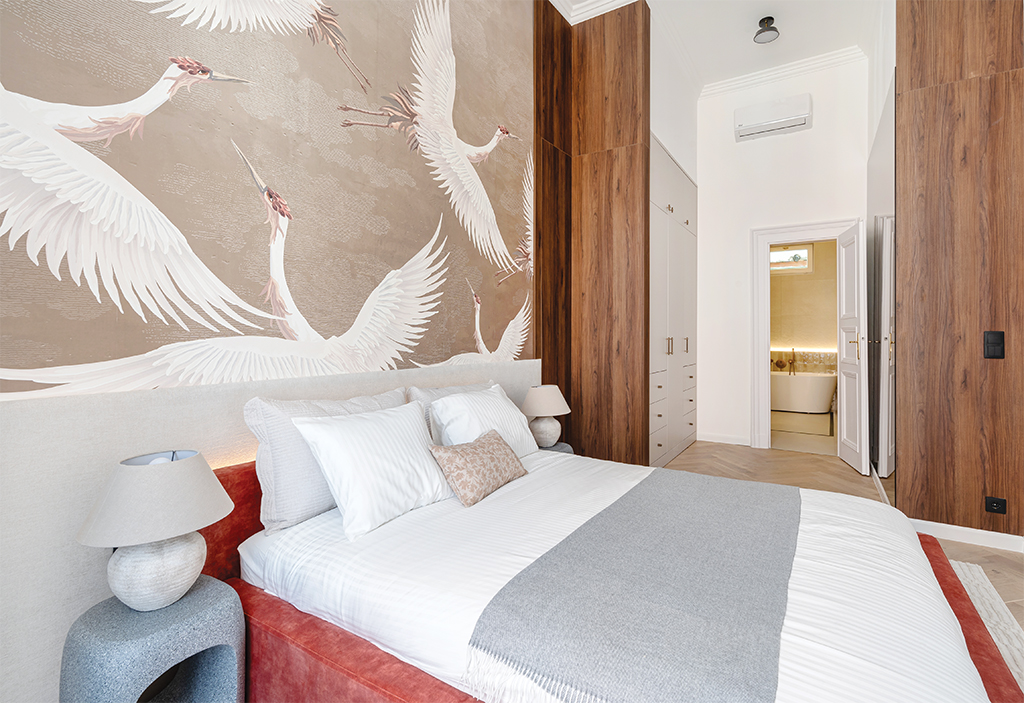 A hosszú, klasszikus folyosót díszlécek, gyűrűcsillár és kortárs festmények teszik különlegessé, játékosan oldva a szigorú geometriát. Igazán látványos elem és jól illik fiatal tulajdonosa karakteréhez a hálószoba madaras tapétája, amely a szabadságot szimbolizálja. Ugyanez a motívum köszön vissza a fürdőben is, ezzel teremtve egységet a lakás egészében. A fiatal lány részben home office dolgozik, ezért volt feltétlenül szükség egy dolgozószobára, amely inspiráló, meghitt, nyugalmat garantál. A két fürdőszoba szintén különleges: vendéglátónk saját fürdőjében a barna mosdópult és a fehér mosdótál harmonikus összhangot alkotnak, az amorf tükör pedig játékosságot visz a térbe. A vendégfürdőben a dupla mosdótál és a hosszú, lekerekített tükrök mellett a rejtett világítás ad modern, hangulatos atmoszférát.