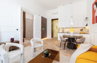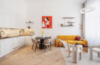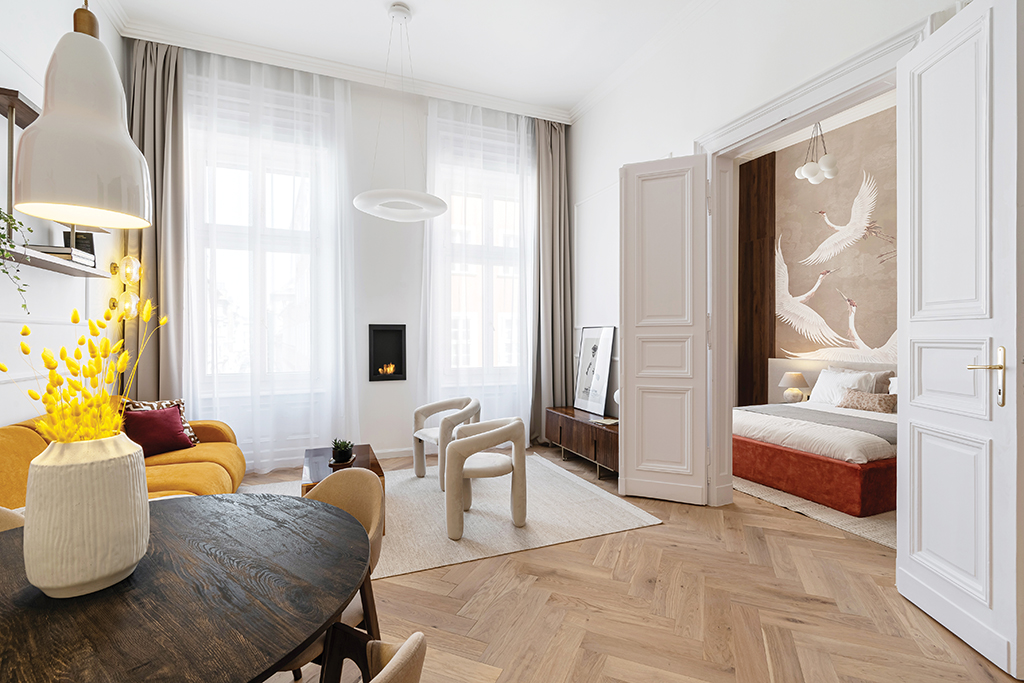 A budapesti Palotanegyed mindig is különleges helyszíne volt a fővárosnak: történelmi házai, klasszikus homlokzatai és hangulatos utcái egyedülálló környezetet teremtenek. Ebben a városrészben örökölte meg fiatal, friss diplomás vendéglátónk a nagymamája 85 négyzetméteres lakását, amely így élete első, saját otthonává vált. A terek kialakítását Mede Mariann és Bojtos Emese jegyzi, akik érzékenyen, a legfinomabb részletekre is ügyelve dolgoztak. Az alaprajz átalakítása során a nappali, étkező és konyha egy légterűvé vált, ami nyitott, világos és barátságos központját adja a lakásnak. A nappaliban a hófehér falakat díszlécből kialakított szakaszok tagolják, amelyek visszautalnak a klasszikus enteriőrök eleganciájára. A fiatalos energiát ugyanakkor kifejezi a narancssárga kanapé, amelyet dizájner fotelek és egy légies asztalka egészít ki. Az enteriőr egyik ékköve a különleges csillár, amely szép kompozíciót alkot környezetével. A konyha modern, hófehér, zárt frontú bútorai szinte a falba simulnak, így letisztult, rendezett összhatást keltenek. A márványmintás hátfal és a rejtett világítás finom luxust csempész a térbe, amely így egyszerre funkcionális és elegáns.