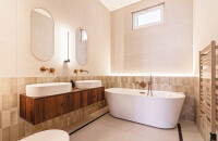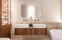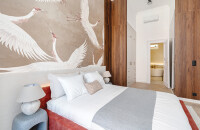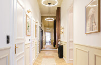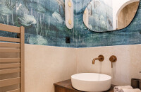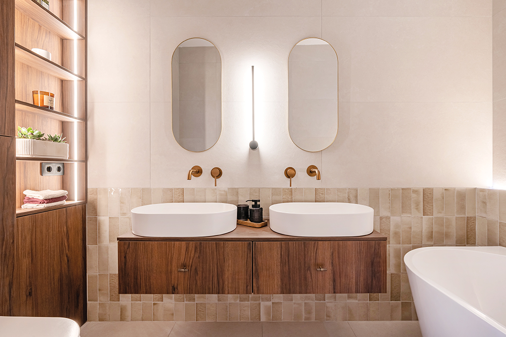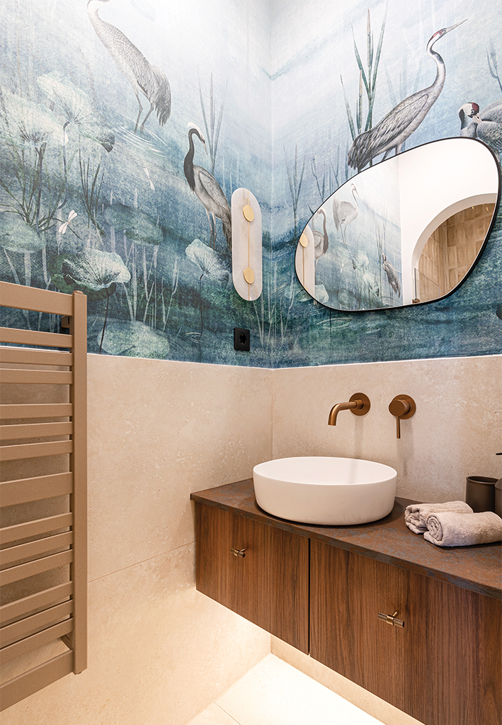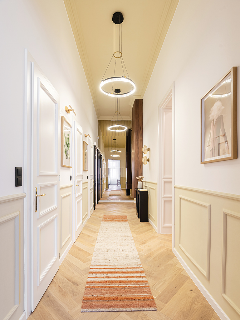 A hosszú, klasszikus folyosót díszlécek, gyűrűcsillár és kortárs festmények teszik különlegessé, játékosan oldva a szigorú geometriát. Igazán látványos elem és jól illik fiatal tulajdonosa karakteréhez a hálószoba madaras tapétája, amely a szabadságot szimbolizálja. Ugyanez a motívum köszön vissza a fürdőben is, ezzel teremtve egységet a lakás egészében. A fiatal lány részben home office dolgozik, ezért volt feltétlenül szükség egy dolgozószobára, amely inspiráló, meghitt, nyugalmat garantál. A két fürdőszoba szintén különleges: vendéglátónk saját fürdőjében a barna mosdópult és a fehér mosdótál harmonikus összhangot alkotnak, az amorf tükör pedig játékosságot visz a térbe. A vendégfürdőben a dupla mosdótál és a hosszú, lekerekített tükrök mellett a rejtett világítás ad modern, hangulatos atmoszférát.