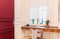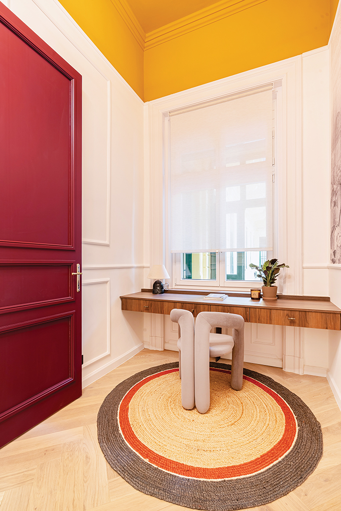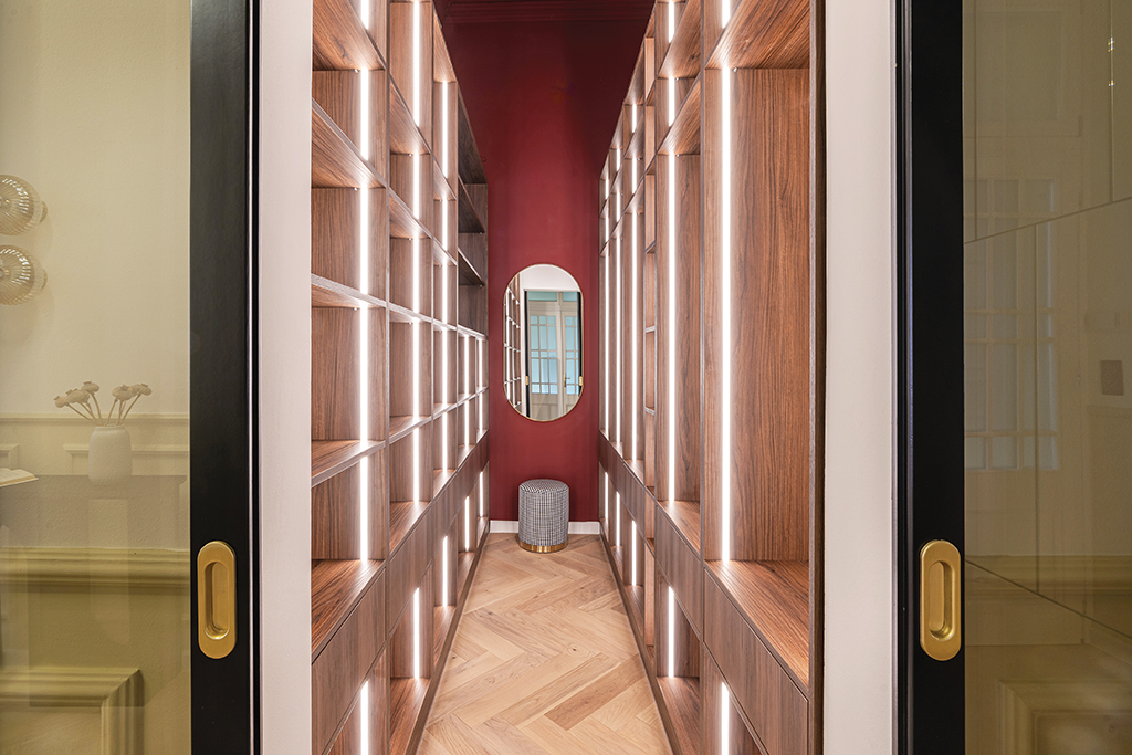 A lakás egyik rejtett gyöngyszeme a lichthofra néző gardrób, amely bordó falainak köszönhetően boudoir hangulatot áraszt. Az ifjú tulajdonos nagyon szereti otthonát, mert egyszerre emlékezteti a múltra, ugyanakkor modern, fiatalos otthont kínál egy új élet kezdetéhez.