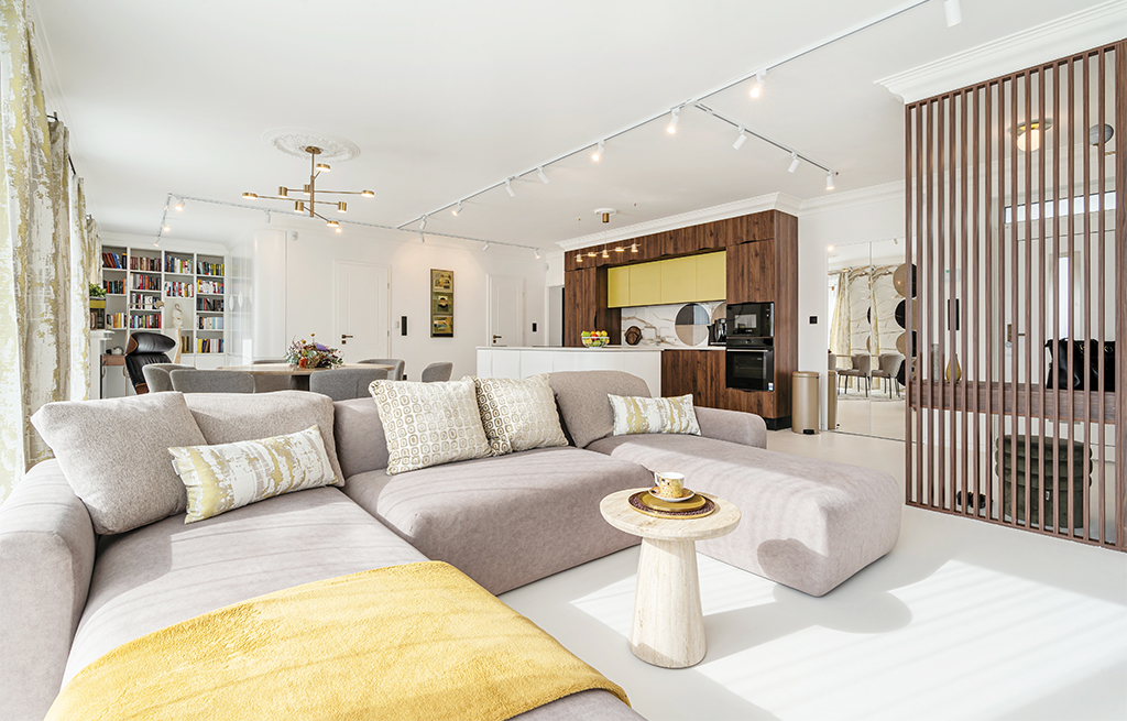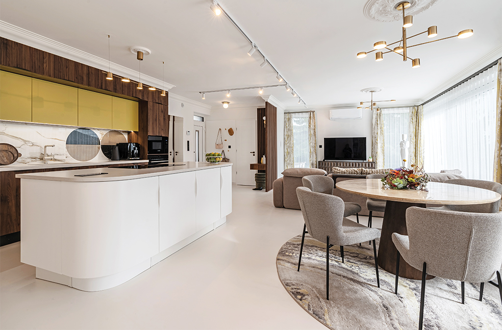 A közös munka során létrejött otthonban a hagyományos értelemben vett szobákról nem beszélhetünk: a háztartási és vizes helyiségeken kívül csak a konyha-étkező-nappali-dolgozó egységek kerültek egy térbe, ajtóval elválasztva a hálótól és gardróbtól. A tagolt, széttöredezett hatást elkerülendő, burkolatváltások sincsenek a padlón: mindenhová fehér műgyanta padló került. A bútorok színei mindenütt a fehér, valamint a mid-centuryra oly jellemző sötét diószín, amibe különleges sárgászöld árnyalatot csempésztek. A tulajdonosok régi vágya volt, hogy többféle természetes kőburkolat jelenjen meg, így került a konyhabútorokra technikai kő, a fürdőbe jura mészkő és gránit is. A tervező és a tulajdonosok is egyetértettek abban, hogy a belső teret néhány műalkotással gazdagítsák, így kerültek az enteriőrbe Bodzán Antal szobrászművész alkotásai.
