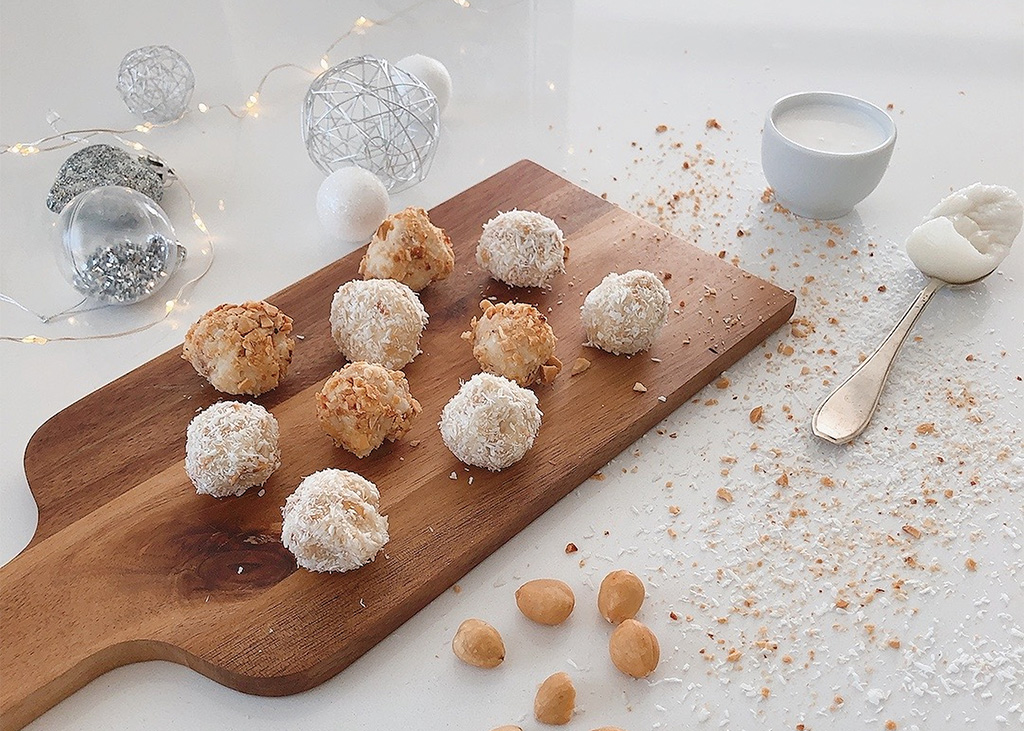 Aprítsuk fel a fehér csokoládét és a mogyorót. Egy edénybe keverjük össze a csokoládét a kókuszolajjal és a tejszínnel. Egy kis lábasban forraljunk fel kevés vizet, és gőz felett kevergetve teljesen olvasszuk fel a csokoládét. Adjuk hozzá az aprított mogyoró felét, keverjük el alaposan. Letakarva legalább egy-másfél órára tegyük hűtőbe. Miután formázható állagúra hűlt a trüffel, teáskanál segítségével kanalazzunk a tenyerünkbe egy-egy adagnyit, és formázzuk golyóvá. Hamar olvad, ezért gyorsan kell dolgoznunk, majd hempergessük meg a kókuszreszelékben és a megmaradt mogyoróban.