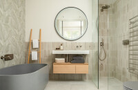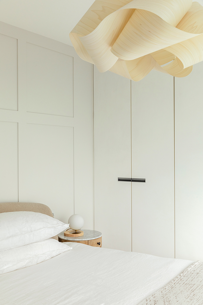 A fő hálószoba szintén nagy átalakítást igényelt, új elrendezést kapott, így valódi pihenőhellyé vált. Az üvegfallal szemben elhelyezett ágy mögött nyílik a spa-hangulatú fürdőszoba, flóderezett üvegajtóval, szabadon álló káddal és lágy fényekkel. A ház első emeleti dolgozószobája ezzel szemben merész és kreatív – inspiráló tér a munka és alkotás számára. A legfelső szinten újabb vendégszoba és egy tágas, kék színvilágú iroda található. Mindkét munkatérből lenyűgöző a kilátás, barátságos, praktikus a kialakítás, hogy hosszabb időt is öröm legyen bennük eltölteni.
