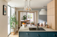 Hampstead szívében ez a négyszobás, kétemeletes londoni családi ház teljes átalakuláson ment keresztül Mia Karlsson belsőépítész vezetésével. A tulajdonosok célja az volt, hogy a család igényeinek megfelelően tágas élettér, kényelmes vendégszoba és két otthoni iroda is helyet kapjon benne. Mindez egy félig nyitott nappali–étkező–konyhával és két privát kültéri terasszal valósult meg. Az átalakítás elsődleges feladata a földszint megnyitása és világosabbá tétele volt, a ház alacsony mennyezete és sötét padlója ugyanis nyomasztóan hatott, ezért a burkolatot világos tónusúra cserélték, ami azonnal tágasabb, szellősebb érzetet keltett. A funkcióváltás az átalakuláshoz is hozzájárult, az apró mellékhelyiségből kompakt, beépített ruhatároló lett, praktikus megoldásként illeszkedve az új enteriőrbe.