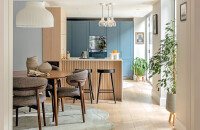 A régi, elavult konyhát teljesen újratervezték, a koncepció vezérelve a teraszra nyíló kilátás, a nappali és az étkező közötti átláthatóság volt. Mia két tónusú, világos tölgy szekrényeket tervezett és alacsonyabb bútorokat, hogy akadálytalanul átengedjék a fényt, miközben a mennyezet magasabbnak tűnik. Egy rejtett, mély kamra is helyet kapott, amely praktikus tárolási lehetőséget biztosít. A földszintet tehát ma divatos nyugodt, földszínek és organikus formák uralják, a kék, zöld, szürke és barna árnyalatokat a műtárgyak és kiegészítők élénk színei egészítik ki, a szőnyegek, a kerekded formájú székek, asztalok és lámpák pedig egységes, lágy ritmust teremtenek.