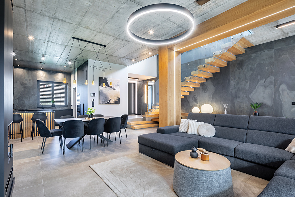 A szobák hangulata, atmoszférája pontosan megfelelt elképzeléseiknek. A látszóbeton mennyezet kissé loftossá teszi a ház légkörét, fiatalos, modern, lendületes. Gabi változatos formavilágú dizájncsillárokat választott hozzá, amelyek szépen öltöztetik a tágas tereket. A nappaliban a szürke sarokkanapé egy körasztalkát fog körül, ehhez a gyűrűforma csillár remek ötlet, harmonizál a minimalista térrel, nem túl díszes, mégis látványos. A kanapé mögött a teljes falszakasz szürke, nyers felületű, míg a terasz felé teljes üvegajtók nyílnak. A fa lécek formájában jelenik meg az enteriőrökben, impozáns részlet például a tévé mögötti hátfal. Noha a beton, a nyers felület folyamatosan visszatérő motívum, a dekorációk, a homokszínű, puha szőnyeg, a szép textíliák szépen öltöztetnek, lágyítanak. Bár a konyha egy légterű a nappalival és az étkezővel, mégis jól elkülönülő sziget, hangulatát a zártabb elrendezés és a szürke dominanciája határozza meg, mennyezeti fényekkel és a bárpult lécezésével oldva.
