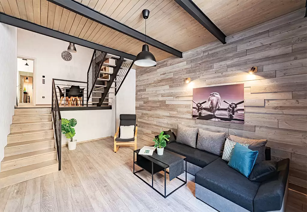 A loftok az 1970-es években terjedtek el Angliában az ipari negyedekben kiürült raktárak, gyárak épületeiben. Az ipari dizájn évek alatt népszerű lett világszerte, s ma már a legelegánsabb és legdrágább otthonok között is szép számmal találunk loftokat is. Vendéglátónk azt kérte Nagy Balázs kivitelezőtől, hogy Izabella utcai lakását úgy alakítsa ki, mint egy loftot. A feladat már csak azért is kihívást jelentett, mert mindösszesen 44 négyzetméteren kellett megoldani. Az évek óta rossz állapotban lévő lakás egyedi adottsága a belső, 1 méteres szintkülönbségből, illetve az 5,3 méteres belmagasságból adódott. A felújítás alapkoncepciója a belmagasság kihasználása, és egy modern, különleges enteriőr kialakítása volt. A lakás egészére jellemző a különleges falburkolat. Vendéglátónk úgy véli, a lakás egyediségét, szépségét a sok fa falburkolat adja, valamint a parketta vagy a famintázatú padlóburkolat az étkezőben. Mindenhol a tölgyfa színe és mintázata jelenik meg, erősítve a terek egységességét.