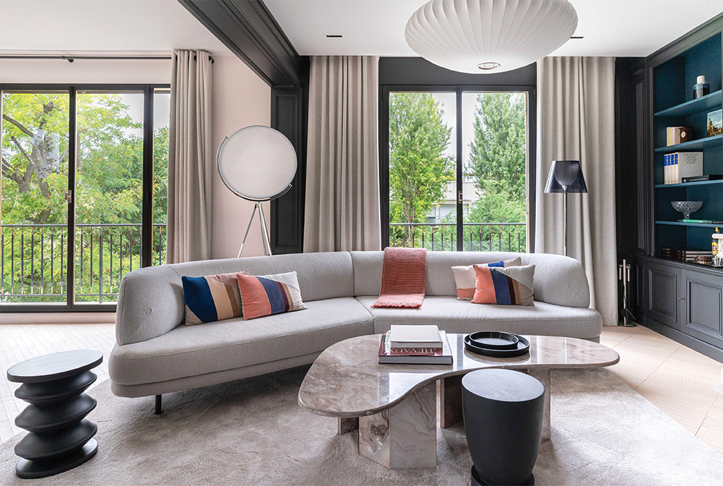 A Párizs melletti Neuilly szívében, egy modern épület legfelső szintjein található ez a különleges, 210 négyzetméteres otthon. Az enteriőr visszafogott, mégis gazdagon komponált: letisztult formák, kézműves részletek és családi emlékek találkoznak benne, miközben minden tér a fényt ünnepli.