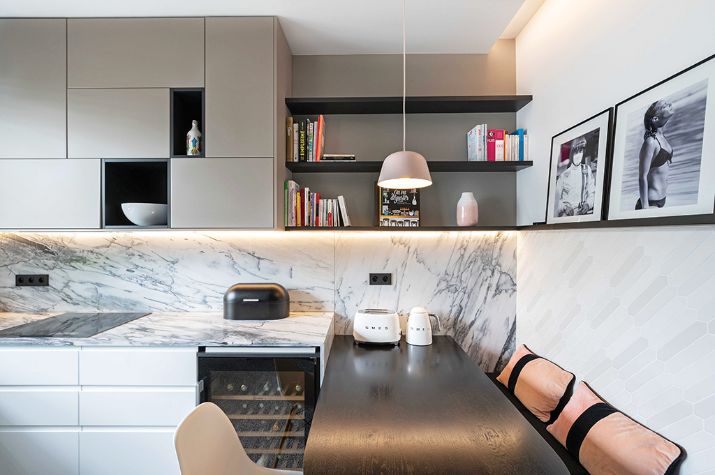 A helyiségek elrendezését mindenképpen módosítani kellett, a szerencsétlen elosztás miatt a különválasztott helyiségekből tágas és világos terek születtek, ahol a funkciók finoman áramlanak egymásba. A lakás négy, gondosan megtervezett élettér köré szerveződik, biztosítva a kényelem, az intimitás és a családi együttlét harmóniáját. A napfényes nappali kifinomult asztalosmunkáival és meleg tónusaival a lakás szíve. A szülői lakrészhez elegáns, márványburkolatú fürdőszoba tartozik, amelyet finoman megmunkált, egyedi üveg- és fa válaszfal választ el a hálótértől. A két gyerek hálószobájának külön szintet alakítottak ki, hogy mindenkinek saját, személyre szabott birodalma lehet, esztétikus, mégis funkcionális berendezéssel. A felső szinten egy dolgozószobát is berendeztek, ahonnan kijárat nyílik a tetőteraszra – a város fölötti nyugalom helyszínére.