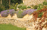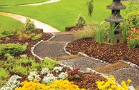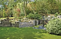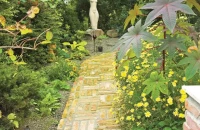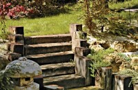 Ha nincs ötletünk kertünk stílusát illetően, érdemes körbenézni, mely berendezési tárgyakat tudnánk elképzelni kertünkben, mik a „szívünk csücskei”. Ezek meghatározzák az egész kert hangulatát, megadják a „genius locit”, a hely szellemét. Ezekhez lehet további anyagokat szerezni. A nyugodt hangulatú fa pihenőszék sötét tónust kölcsönöz a kertnek. Ezt az otthonos hangulatot erősíti a régi fagerendákból épített támfal és tömblépcső is.