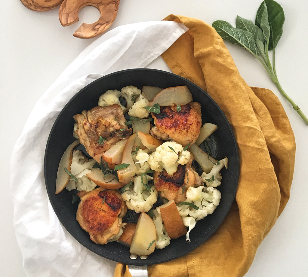 A csirkét mossuk meg, és papírtörlővel töröljük szárazra, majd sózzuk meg. A körtét vágjuk cikkekre, a karfiolt szedjük rózsáira, a zsályát csíkozzuk fel. Egy serpenyőt tegyünk a tűzhelyre melegedni, s amikor már elég forró, bőrös felükkel tegyük bele a csirkéket, és pirítsuk meg. Vegyük közepesre a lángot, fordítsuk meg a combokat, és dobjuk alá a vajat és a zsályát. Amikor ez a felük is kapott egy kis színt, fordítsuk ismét bőrös felükkel lefelé, mehet rá a körte és a karfiol. Fedővel letakarva pároljuk 20 percig, majd a fedőt levéve pirítsuk le a csirkét.