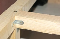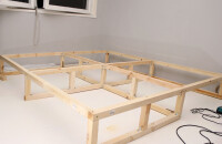 Egy kb. 2×2 méteres dobogó vázát 48 milliméteres négyzetes gerendákból építsük meg. Számoljuk ki, hogy a 3 méteres készen kapható darabokból hogyan érdemes leszabni a fadarabokat, hogy minél kevesebb hulladék keletkezzen. Használjunk erős facsavarokat, L idomokat, és a köztes merevítéseket se spóroljuk meg. Mindig fúrjunk elő a csavaroknak, hogy elkerüljük a fa szétrepedését. Az alsó merevítésen ne tegyünk vízszintes gerendákat arra a részre, ahová a fiókokat vagy az ajtókat tervezzük, mert azok akadályozzák a görgők kigurulását, illetve a kényelmes pakolászást.