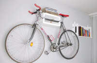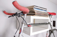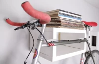 Ha a kerékpárunkat a szobában tároljuk, készítsünk neki fali tartót, ami polcként is funkcionál. Elkészítéséhez legalább 25 milliméteres fenyődeszkát használjunk. Az oldalsó elemekbe vágjunk lekerekített mélyedést, ide kerül a váz (női kerékpár esetén a vázforma miatt a művelet furmányosabb, de nem lehetetlen). Fúrjuk elő, és csavarozzuk össze az elemeket, majd fessük le, és erős L idomokkal rögzítsük a falra.