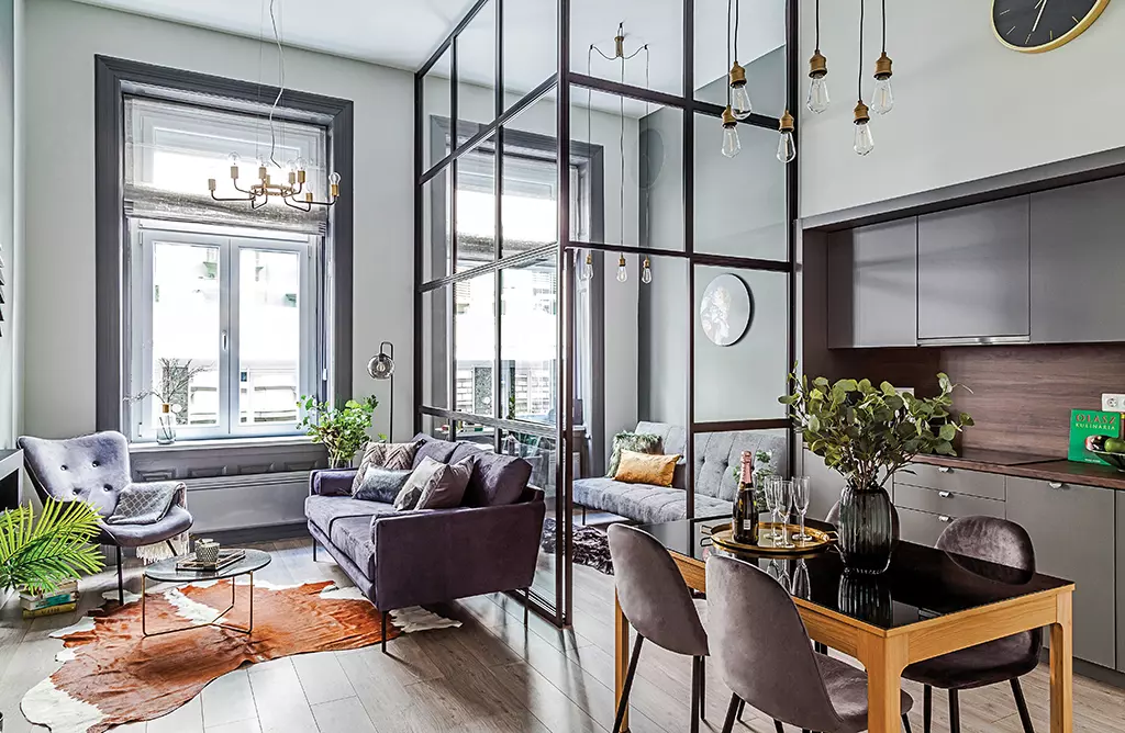 Harmincas vendéglátónk egyedülálló hölgy, sokat utazik, és már nagyon vágyott arra, hogy valahol megállapodhasson. A belvárosi, régi bérházban kialakított 48 négyzetméteres lakás tökéletes helynek tűnt ehhez, hiszen könnyen megközelíthető, a főváros pulzálásában helyezkedik el, mégis csendes, intim és zárt a környezete. A ház udvara is lenyűgöző, dúsan zöld, gondozott kertje van, és egy hatalmas magnólia fa ágai lógnak be a körfolyosóra. Olasz Enikő vállalta el a cseppet sem könnyű feladatot, ugyanis a lakás olyannyira rossz állapotban volt, hogy az utolsó szögig mindent ki kellett cserélni vagy felújítani. „Régóta szerettem volna egy loft hangulatú lakást kialakítani, és ez a tér tökéletesen alkalmasnak tűnt erre, hiszen mindent átépíthettünk.” Az anyaghasználat igazán nagyvonalú. Nagyon sok üvegfelület jelenik meg, amely remek hátteret ad a szürkének és az ezüstszínnek, a szép textíliáknak, a glamouros kiegészítőknek. A térfelosztás annyiban egyedi, hogy a folyosóról a nappali-étkező-konyha egységébe jutunk, ahol egy üvegfallal leválasztott dolgozószobát is kialakított a tervező.