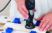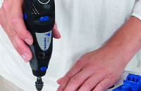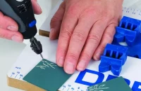 Cseréljünk szárat a multifunkcionális gépünkben, és fúrjuk ki körfúróval az odú bejáratát, egy kisebb fúrószárral pedig az ülőrúd helyét. Fúrjuk ki a tetőn a két lyukat, ahol az akasztót fűzzük majd át. Csiszolókoronggal csiszoljuk simára a levágott darabokat.