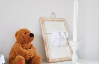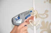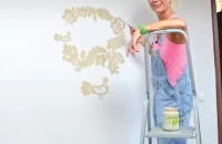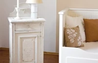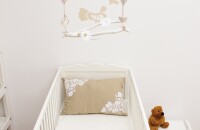 A falak fehérségét meghagytuk, de a nagy ágy mögötti falrészt világosbarnára festettük, megtörve ezzel a fehér steril hatását. Az ágy fölé egy különleges, keretbe feszített csirkehálóból készült fotótartót akasztottunk, amire fa csipeszekkel rögzíthetők a családi képek. A kiságy fölé belógó díszhez csak faág, festék (babafesték!), szalag, néhány díszítő elem és egy ragasztópisztoly szükséges. Egy méretesebb faágból akár ruhaállvány is készíthető, amelyen a babaruhák mini vállfákra akasztva sorakozhatnak. Az éjjeli szekrény egy régiségkereskedésből való, ami felújítva tökéletes kiegészítője a szobának. Rajta az asztali lámpa Viki keze munkája: a pöttyös ernyős lámpabura fehérre fújt, összeragasztott konzervdoboztalpakon áll. A horgolt babacipő egy fa keretbe ragasztva kedves dekoráció. A népmesemotívum felfestéséhez az internetről töltöttünk le sablont. Kinyomtattuk, és indigóval átrajzoltuk a falra, majd vékony ecsettel megfestettük.