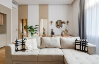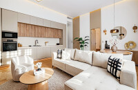 A tervező klasszikus polgári hangulatú, mégis modern, kényelmet nyújtó enteriőrt hozott létre. A föld színei dominálnak a lakásban: különböző árnyalatú barnák ölelik körül a teret, amelyeket fehér és fekete részletek tesznek dinamikussá. A bútorválasztás során a természetes anyagok kaptak főszerepet, a szobákban a tölgypadló és a kárpitozott ülőbútorok meghittséget teremtenek. A lakás szíve a tágas, egy légterű nappali-konyha-étkező. Barbara a nappali középpontjába egy kényelmes, karamellszínű kanapét helyezett el, körülötte gondosan válogatott részletek találhatók: modern, fa dohányzóasztal, ívelt fotel és egy puha, kör alakú szőnyeg, amely optikailag összefogja a teret. Dominánsan jelennek meg az organikus vonalak, a házaspár kedvence az étkező kerámiavázája. A konyha modern, letisztult megjelenésével tökéletesen illeszkedik a nappali egy légterű kialakításába. A tömör fa és a világosbarna bútorfrontok melegséget sugároznak, miközben a rejtett fogantyúk és az egyenes vonalvezetés kortárs eleganciát, míg zárt szekrények rendezett megjelenést biztosítanak.