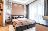 A nappali fókuszpontja mind színeiben, mind mintavilágában a merész tapétapanel, ami egyben elrejti a hálóba vezető ajtót is. Ezzel optikailag nyújtja a nappalit, és összekapcsolja a konyhaétkezővel, ahol az L alakú konyha fogja közre az étkezőt. A nappali szürke bársony kanapéja ágyazható is alkalmi vendégek számára. A tulajdonosnak talán a hálószoba a lakás legértékesebb része, amelyet az eredeti alaprajz teljesen nélkülözött. Az újratervezésnek köszönhetően nemcsak egy kényelmes franciaágy, de még egy munkasarok is helyet kaphatott benne. Sőt, innen nyílik még egy gardróbhelyiség is., maximális térkihasználással, padlótól plafonig bútorozva, tágas tolóajtóval kapcsolva a szobához. A háló fókuszpontja az ágy mögötti fal, sajátos színhangulatú tapétapanel és a nappaliban használt színek finomabb, nyugalmat sugárzó tónusvilágával. A fürdőszoba is tovább fűzi az egész lakásra jellemző színhangulatot. A kis lakás ékszerdoboz-hangulatát szép lámpatestekkel és kiegészítő és hangulatfényekkel lehetett tovább emelni.