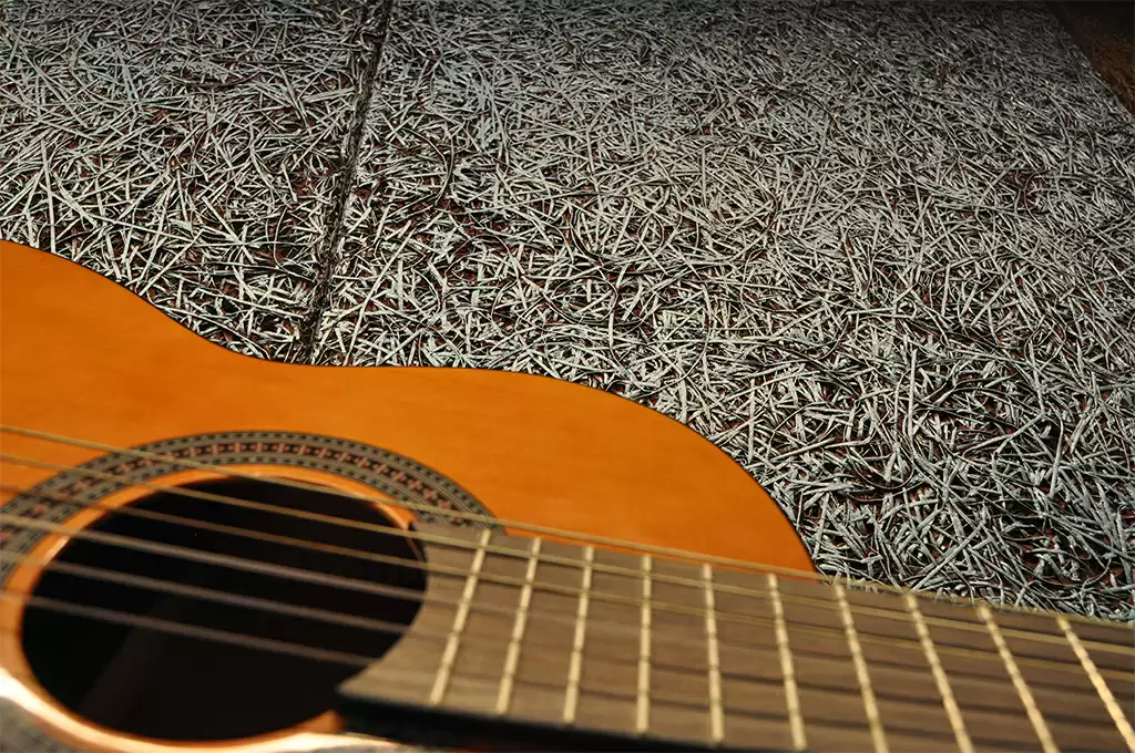 Ezt alapvetően három típusú teremakusztikai burkolattal biztosítottuk. Az egyik a szélessávú elnyelő, amelyet a Knauf Insulation által gyártott Heraklith C, 35 mm vastagságú fagyapottáblákkal alakítottunk ki, amely mögé 50 mm vastag ásványgyapotot tettünk. Ez a kombináció igen hatékony hangelnyeléssel bír, és számos akusztikai munkában bizonyult már kiváló és költséghatékony megoldásnak. Annak érdekében, hogy ne legyen túlcsillapítva a tér, a mennyezet nagy részén a Heraklith C táblákat nem kombináltuk ásványgyapottal, így azok hangelnyelési foka jelentősen alacsonyabb. De nem csupán hanggátló, hanem esztétikai szerepe is van a Heraklith-nak. Egyedi domborzatának köszönhetően a festés különleges látványt nyújt, ezzel emelve a terem hangulatát. A lapok jellegzetes felületi struktúráját felhasználva készültek a „kétszínű” festések. Egy matt türkiz színre lefújt Heraklith táblára került fényes felületi hengerelés dekorfestékkel kék és bronzszínben, és egy matt vörösesbarnára fújt Heraklith-ra került ugyanaz a fényes kék és bronz dekorfesték, egészen más hatást eredményezve. A vászonhoz közeli mennyezeten maradt a matt vörösesbarna szín. Mindezt változtatható színű ledsoros világításokkal lehet különbözőképpen megvilágítani. Ez az egyedi megoldás különleges hangulatot áraszt a zene szentélyébe belépők felé.