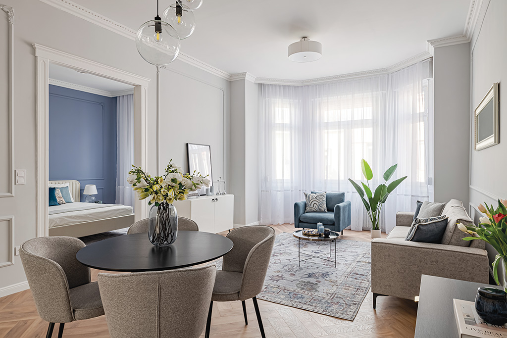 Vendéglátónk hosszú évekig várt, mire megtalálta a XIII. kerület, Pozsonyi út közelében lévő lakást. Olyan otthonra vágyott, amely alapvetően frekventált, szép miliőben van, de alkalmas a visszavonulásra is. A régi építésű polgári házban kialakított lakás tökéletesen megfelelt ezeknek a szempontoknak. A negyvenes éveiben járó, jogászként dolgozó hölgy azt kérte Jenőfi Rékától, a Renna Home szakemberétől, hogy a szobák eleganciát sugározzanak, legyenek mértéktartóak, a privát és a közösségi zónák pedig jól különüljenek el egymástól.