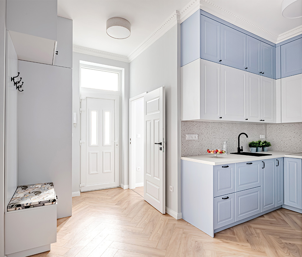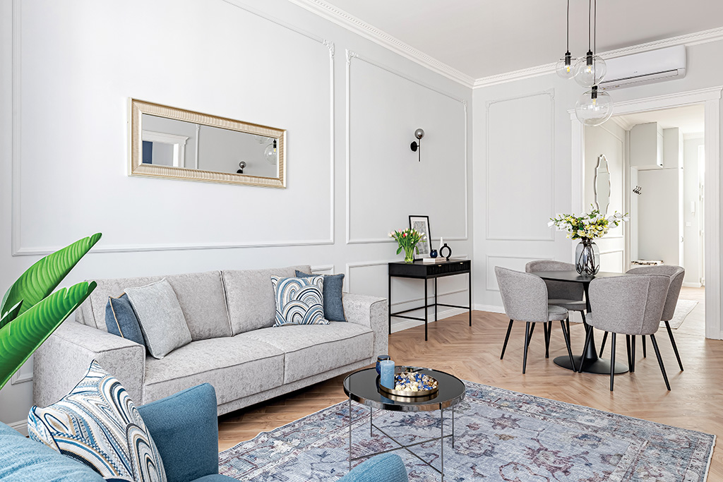 A belső tereket erősen karakterizálja a szürke, a kék és a fekete párbeszéde. A nappali központi eleme az esztétikus, lábon álló, világosszürke kanapé, amely mellett nemes egyszerűséggel jelenik meg a körlapos asztalka. A díszpárnák a puhaság, a barátságos hangulat nélkülözhetetlen elemei ebben a lakásban is. Kiválóan illik a térbe a kézi szövésű, keleti szőnyeg, fokozza az elegancia érzetét. Réka nagyon jó harmóniaérzékkel dolgozott, és a kanapé fölé egy glamouros tükröt helyezett el, amely kiegészítő festményként hat a térben. A világos színek dominanciája folytatódik a konyhában, a klasszikus légkört itt is kiegészítik a modern megoldások. A halványkék és szürke frontokkal ellátott bútor praktikus, finom megjelenésű, nagy tárolófelületekkel rendelkezik.