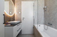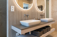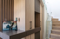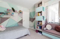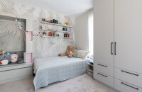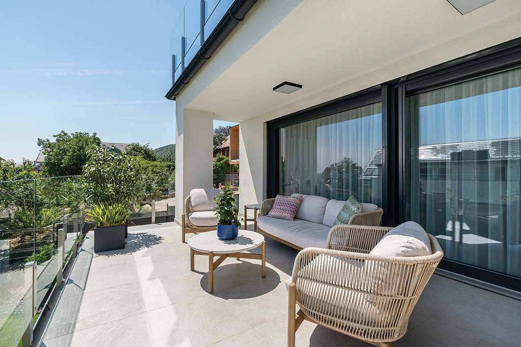 A kényelmes, üveggel határolt lépcső a privát zónába vezet, ahol a szülők saját birodalma és a gyerekek privát szférái vannak. Minden hálóhoz erkély kapcsolódik, a nappaliból pedig egy nagy terasz nyílik. A gyerekszobák színes, játékos világot tükröznek, a kisebbik gyermekét pálmaleveles tapéta, kuckós ágy és izgalmas tárolóelem teszi otthonossá, míg a nagyobbnál a tapéta geometrikus rajzolata, a púderrózsaszín, a zöld és barna árnyalatai adják az egyedi hangulatot. A könyvtárolást itt is meg kellett oldani, a nagylány izgalmasan kombinált könyvesszekrényt kapott e célra. A lamellás motívum itt is és a szülői hálószobában, valamint a fürdőszobában is megjelenik.