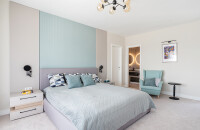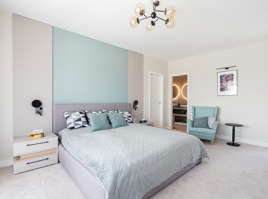 A szülői hálóban a türkizzöld hátfal remekül kiemeli az ágyat, a szürke tónusok szép egyensúlya a pihenést szolgálja. Vendéglátóink úgy érzik, otthonuk valóban nem csupán egy lakás, hanem egy olyan tér, amely minden részletében az életstílusukat tükrözi: egy modern, szerethető, barátságos otthon.