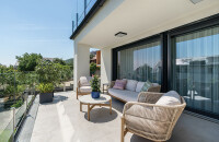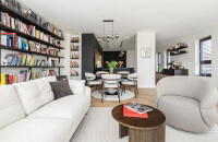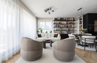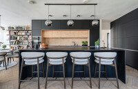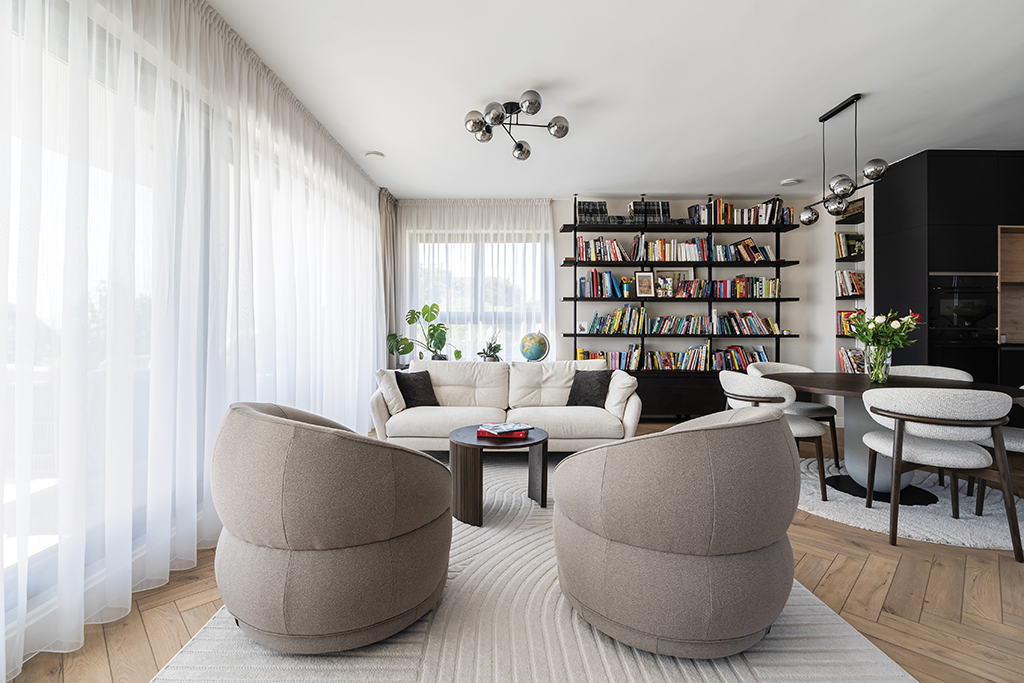 A belső terek funkcionális kialakítása megkönnyítette a munkát, de a részletekben rejlő harmónia létrehozása gondos odafigyelést igényelt. A család minden tagja elkötelezett könyvrajongó, így nem meglepő, hogy a lakásban kiemelt szerepet kaptak a könyvespolcok. A nappali könyves falszakasza nemcsak praktikus, de a tér vizuális középpontja is. A közösségi zóna egyik fő ékköve a modern konyha, amely elegáns, mintegy keretként megjelenő, fekete frontokkal vonja magára a tekintetet. Mellette kapott helyet a család által régóta vágyott baristapult, amely a reggeli kávézások kedvelt helyszíne. Az enteriőr meghatározó stíluselemei a következetes anyaghasználatban mutatkoznak meg: füstüveg lámpatestek, fekete fém, sötét diófafelületek és törtfehér kárpitok adják a karakteres, de otthonos hangulatot.