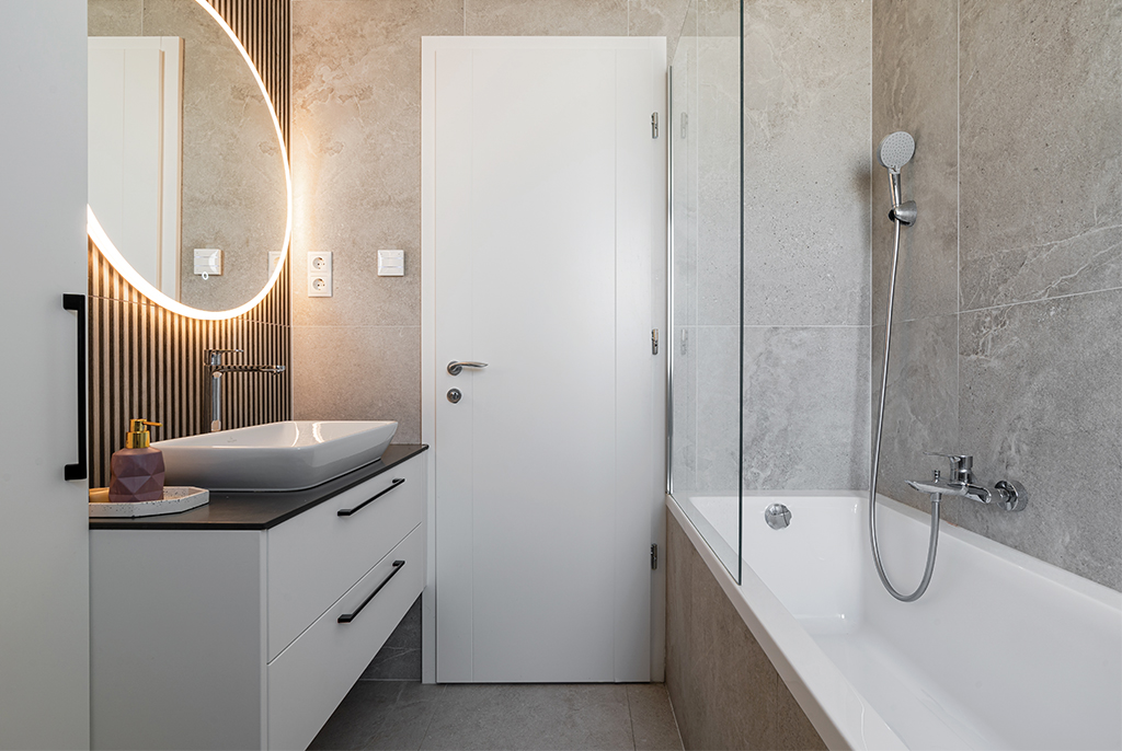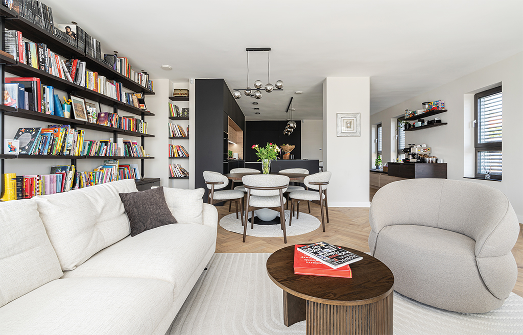 A belső terek funkcionális kialakítása megkönnyítette a munkát, de a részletekben rejlő harmónia létrehozása gondos odafigyelést igényelt. A család minden tagja elkötelezett könyvrajongó, így nem meglepő, hogy a lakásban kiemelt szerepet kaptak a könyvespolcok. A nappali könyves falszakasza nemcsak praktikus, de a tér vizuális középpontja is. A közösségi zóna egyik fő ékköve a modern konyha, amely elegáns, mintegy keretként megjelenő, fekete frontokkal vonja magára a tekintetet. Mellette kapott helyet a család által régóta vágyott baristapult, amely a reggeli kávézások kedvelt helyszíne. Az enteriőr meghatározó stíluselemei a következetes anyaghasználatban mutatkoznak meg: füstüveg lámpatestek, fekete fém, sötét diófafelületek és törtfehér kárpitok adják a karakteres, de otthonos hangulatot.