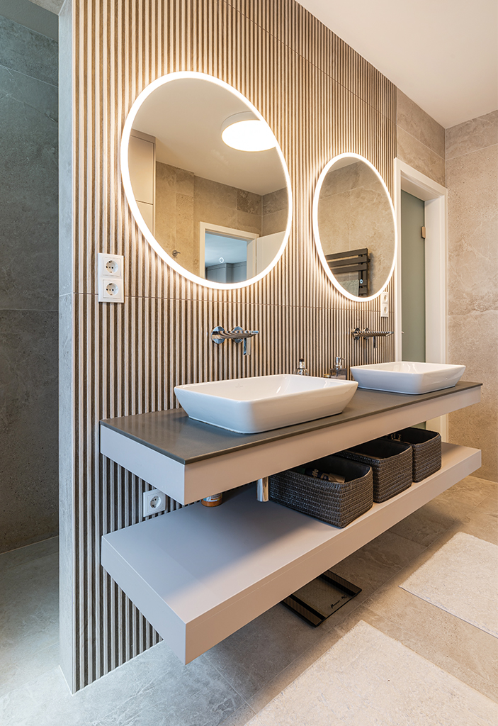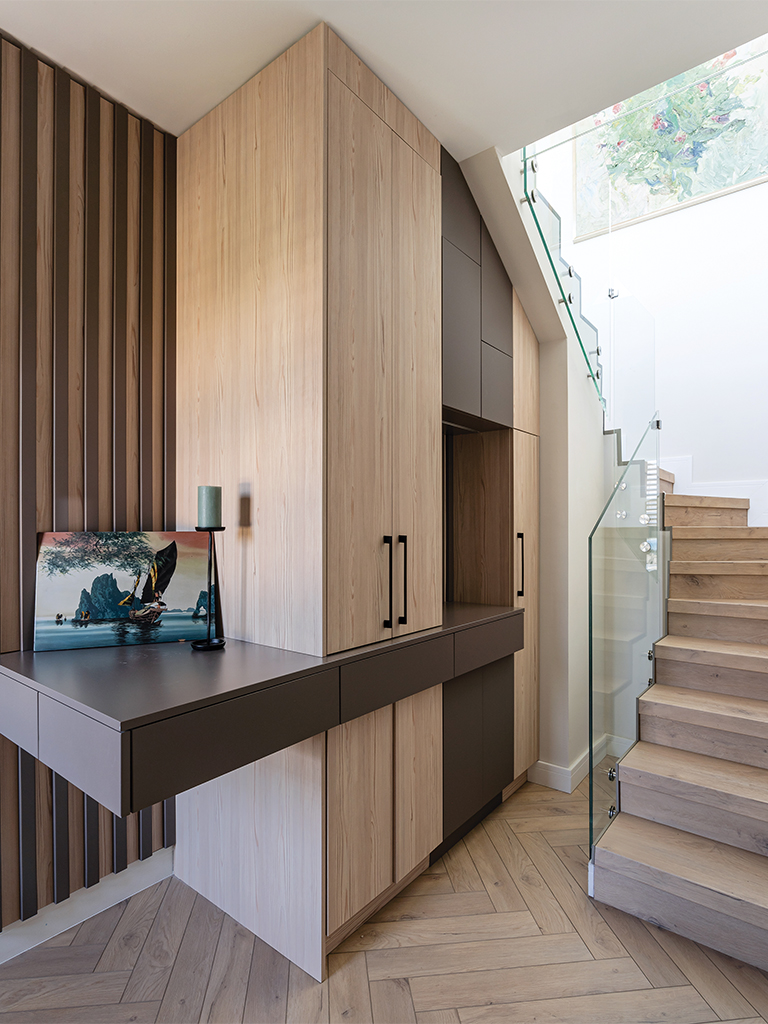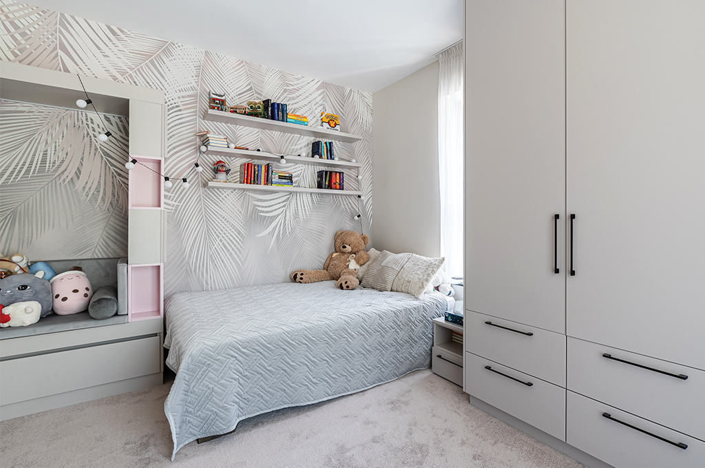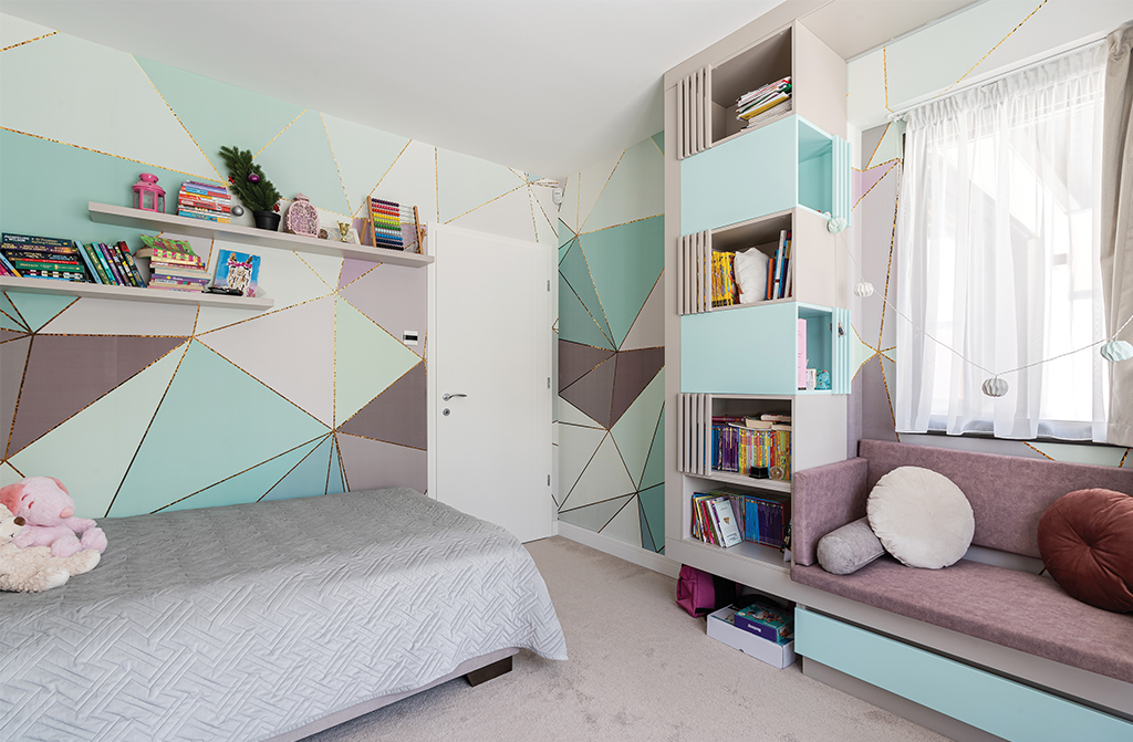 A kényelmes, üveggel határolt lépcső a privát zónába vezet, ahol a szülők saját birodalma és a gyerekek privát szférái vannak. Minden hálóhoz erkély kapcsolódik, a nappaliból pedig egy nagy terasz nyílik. A gyerekszobák színes, játékos világot tükröznek, a kisebbik gyermekét pálmaleveles tapéta, kuckós ágy és izgalmas tárolóelem teszi otthonossá, míg a nagyobbnál a tapéta geometrikus rajzolata, a púderrózsaszín, a zöld és barna árnyalatai adják az egyedi hangulatot. A könyvtárolást itt is meg kellett oldani, a nagylány izgalmasan kombinált könyvesszekrényt kapott e célra. A lamellás motívum itt is és a szülői hálószobában, valamint a fürdőszobában is megjelenik.