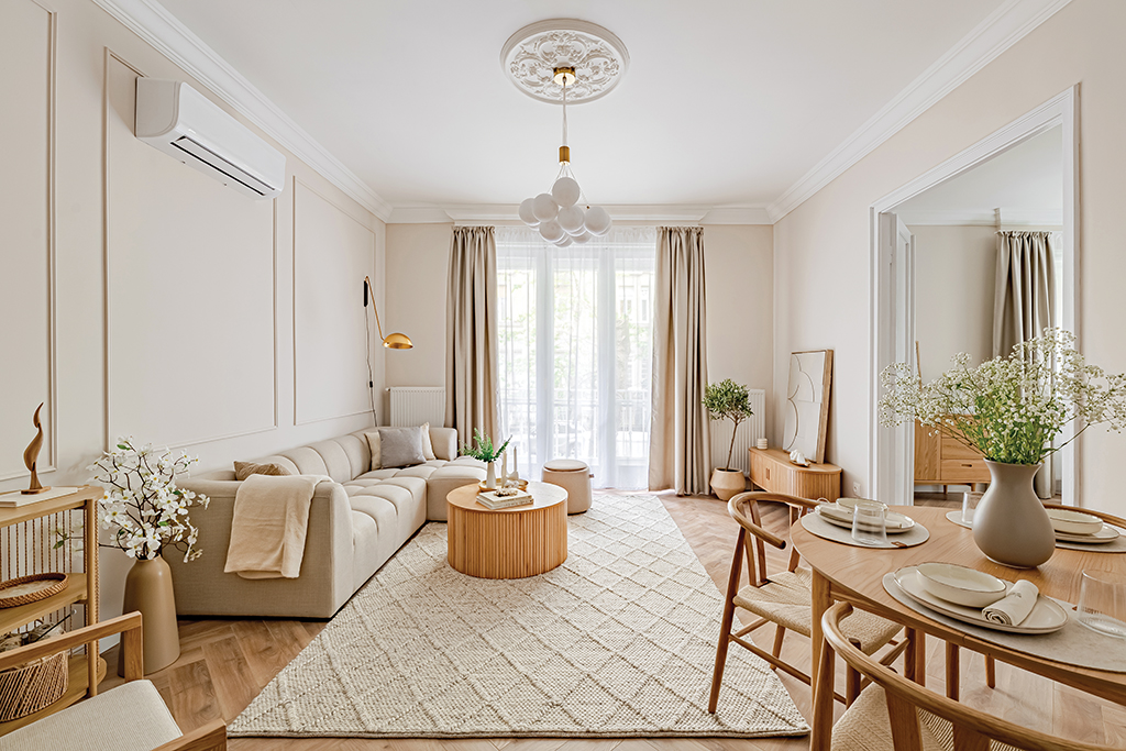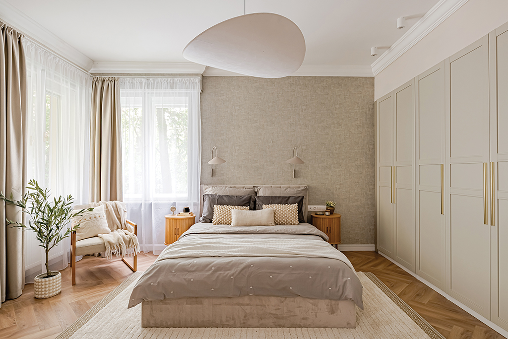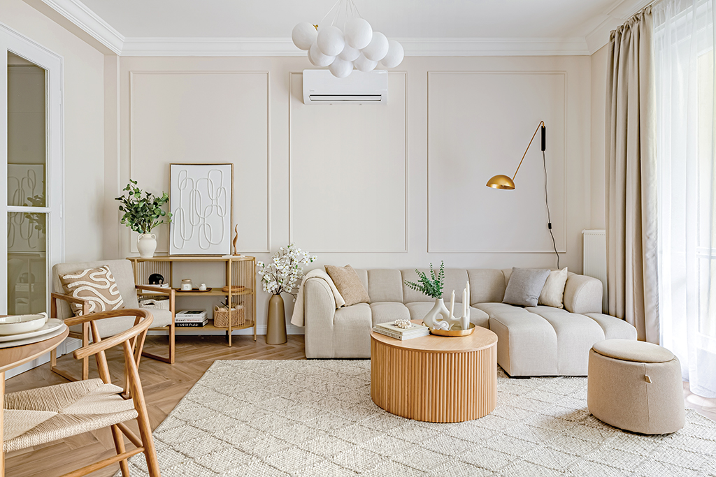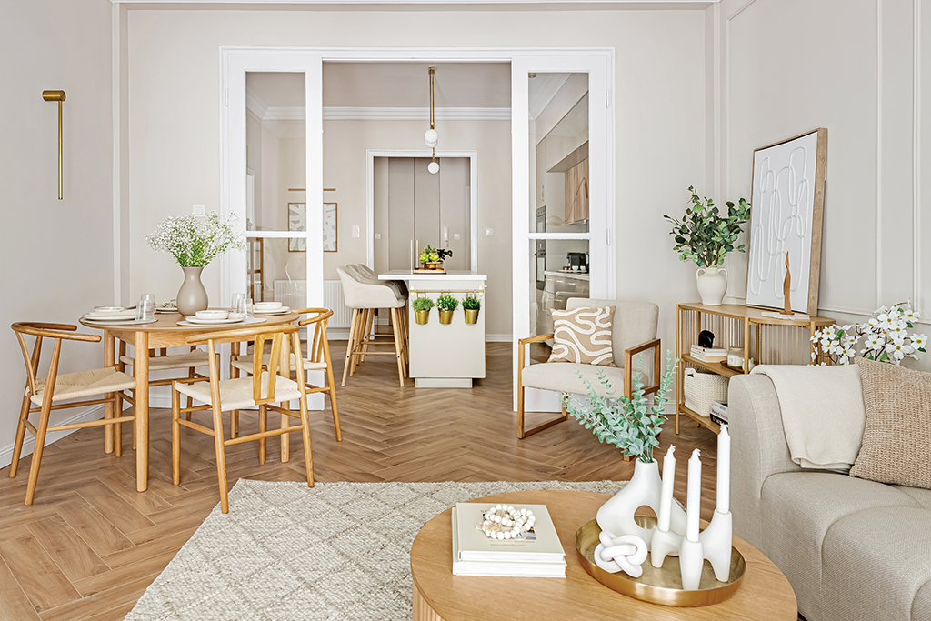 A teljes enteriőrön végigvonul a világos vajszín és a természetes fa harmonikus párosa, melegséget és eleganciát sugározva. A nappaliban szép megoldás a díszléces fal a látványos, vajszínű kanapéval, a kompozíciót pedig egy süppedős szőnyeg teszi hívogatóvá. A mélyen belógatott gömbcsillár polgári hangulatot idéz, a tér mégis kifejezetten modern marad, hasonló került a konyhába is, így is erősítve a vizuális kapcsolatot a terek között. A textileknél a minőség elsődleges szempont volt, így a finom tapintású anyagok, visszafogott árnyalatok és lágy esésű függönyök emelik az összhatást.