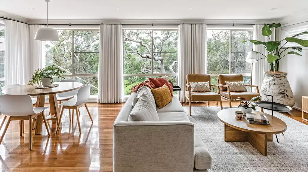 Nem csak az ausztrálok álma, hogy olyan helyen éljenek, ahol jó levegő van. A Sidneytől alig 30 kilométerre található déli külváros, Yarrawarrah ilyen hely. Itt található az a negyven éve épült penthouse lakás, amelynek legfelső szintjének felújítására a Sydneyben 19 éve irodát alapító Michelle Viret lakberendező kapott lehetőséget. Az új tulajdonosok, Oliver és Kimberly, egy friss házaspár úsztak a boldogságban, amikor szert tettek első közös otthonukra, bár akkor az még nem volt lakható állapotban. A lakás csendes helyen, a főutcák mögött, mégis központi helyen fekszik, nagy terasszal. Korábban irodának használták, és megépülése óta nem is igazán volt felújítva. A lakók az eredeti sok kicsi helyiség helyett arra vágytak, hogy egyetlen nagy, fényben úszó nyitott térben éljenek. Michelle a belső falakat szinte teljes egészében lebontotta, a régi padlót kiszedte, hogy tiszta lappal indulhasson. „Természetes anyagok, napfényben áradó szobák és a külvilághoz való csatlakozás fontossága olyan szempontok egy lakásfelújítás során, amelyet minden mai belsőépítésznek szem előtt kell tartania.” – mondja. Innovatív anyagokkal és a fehér falakkal maximálisra növelte a térérzést és a luxushatást. Így született a javaslat a magas fényű, vitrifikált fapadlóra is, hogy a terek között meglegyen az összekötés. A belsőépítész a lakókkal együtt közösen fejlesztette tovább a terveket, és végezték a kivitelezést is.