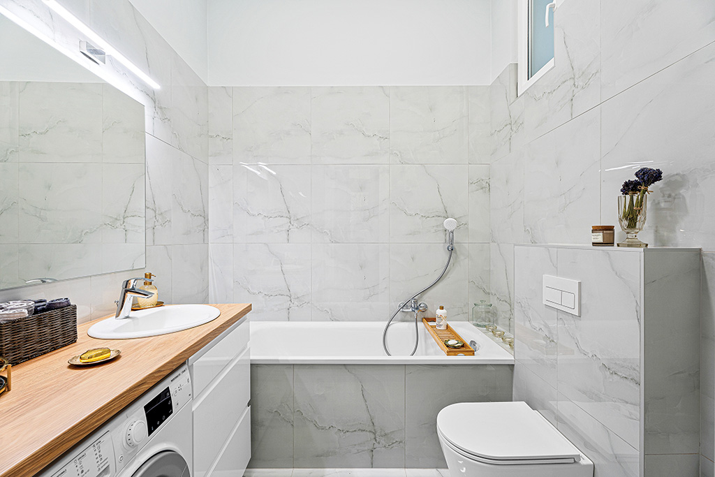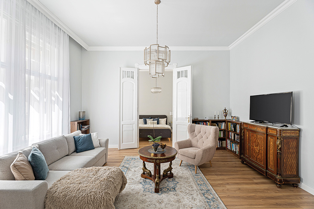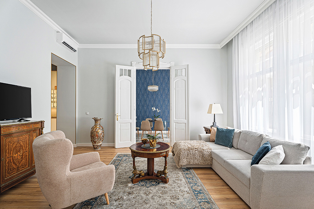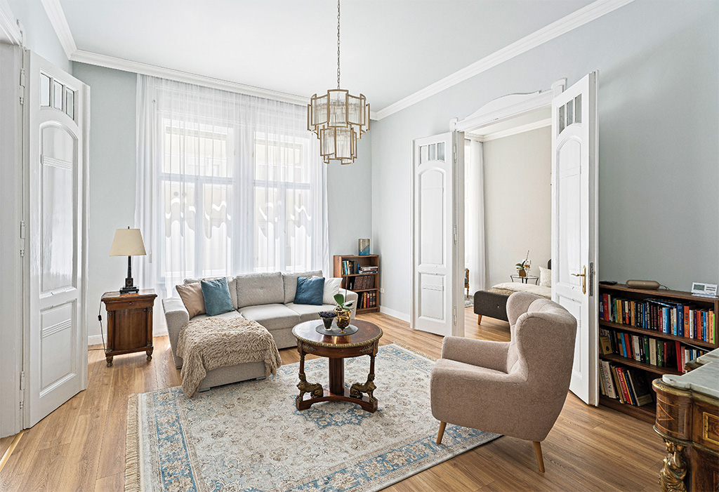 Az eredeti alaprajzot teljesen újragondolták: a konyhát áthelyezték, két új fürdőszobát és egy vendégmosdót alakítottak ki. A folyosón egy négy méteres gardróbszekrény rejti el a mindennapok apróságait, így a terek szellősek és rendezettek maradtak. Az ablakok felújítása és a hőszigetelt üvegezés a műemléki előírások figyelembevételével történt, a bejárati ajtót és a folyosói nyílászárókat újragyártották az eredeti minták alapján. A lakás alapszínei a vajszín, a szürke, a fehér és a kék, amelyek nyugalmat árasztanak. Igazi közösségi tér a nappali, amelynek ülőalkalmatosságai egy-egy antik asztalkát öveznek. A padlón végigfutó parketta alapvetően meghatározza a tér eleganciáját, melyet a kézi szövésű keleti szőnyeg csak tetéz. A dohányzóasztal fölött bronz és üveg csillár ad különleges fényt a térnek.