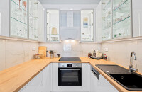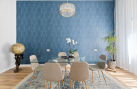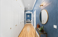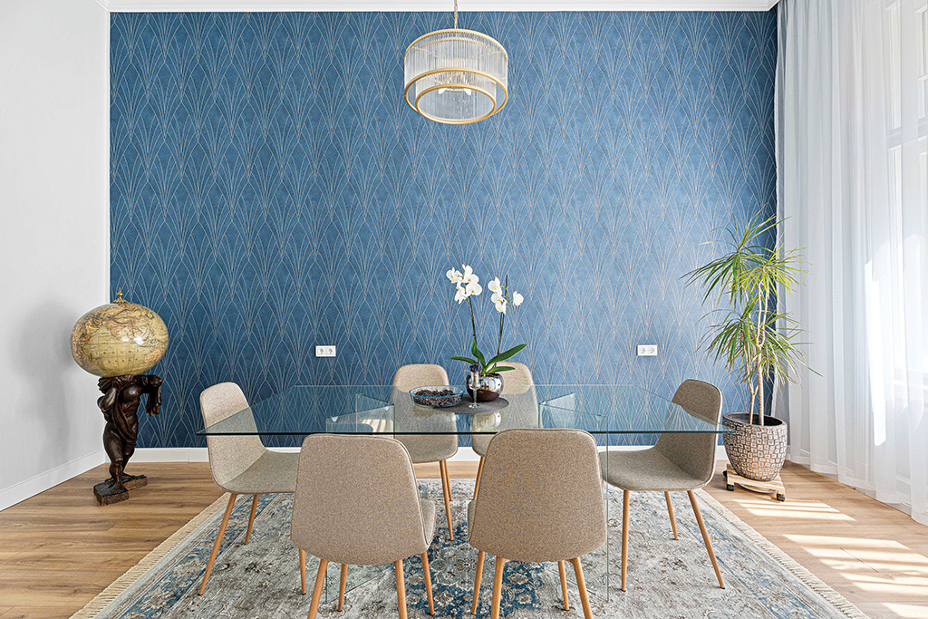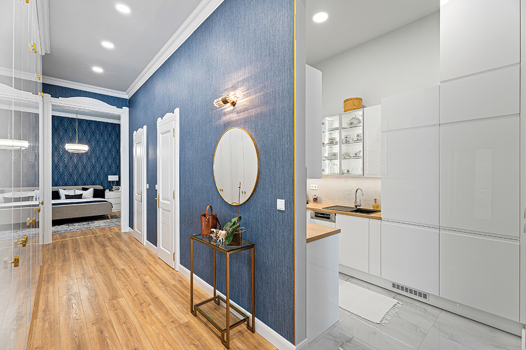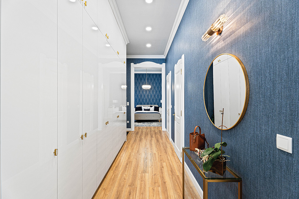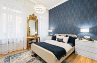A folyosó egyik legszebb eleme a klasszikus hatású, mélykék tapéta, amely visszaköszön az étkezőben és a hálóban is. A konyha a szépség és a funkcionalitás mintapéldája a könnyed, játékos üvegezett felső szekrényekkel, az étkezőben pedig dekoratív székek kaptak helyet üveglapos asztallal. A hálószobában a kék tapétás fal remek a keretet ad a franciaágynak. A fürdőszobákban a márványmintás burkolatok, a mély kád zuhanyzóval modern eleganciát sugároz.