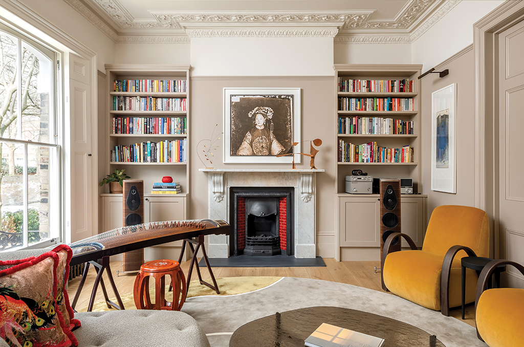 A nappali ikonikus sárga svéd foteljei nemcsak karaktert adnak a térnek, de a skandináv funkcionalitást is megidézik. A ház számos részletében sikerült megőrizni az eredeti elemeket – díszes korlátok, klasszikus, csempézett padlók –, ezzel is tisztelegve az épület múltja előtt. Minden helyiségben sor került a fűtés korszerűsítésére is: a modern, energiatakarékos radiátorok stílusukban a vintage megjelenést idézik, tökéletesen illeszkedve a ház karakteréhez. A lenyűgöző előtérből a földszinti, nyitott alaprajzú nappaliba és zeneszobába léphetünk, ahol egy különleges, eredeti kínai hangszer, a guzheng kapott központi szerepet – a tulajdonos nemcsak birtokolja, de játszik is rajta. A helyiségeket teljes magasságú, kétszárnyú ajtók választják el egymástól, őrizve a ház korhű tagolását.