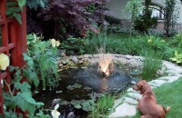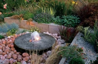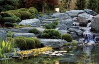 Ha a kert nem is lejtős, a tómederből kiásott földből létrejövő kis dombocska is adhat jó lehetőséget egy attraktív hang- és vízélménynek, a vízesésnek. A kialakításnál ügyeljünk az arányokra, ne feledjük: a kevesebb néha több.
